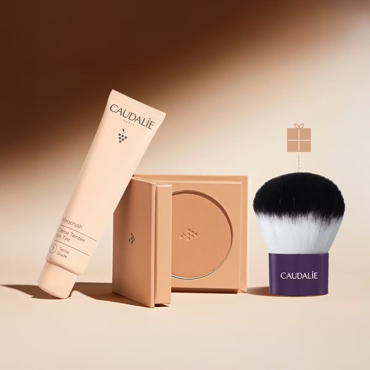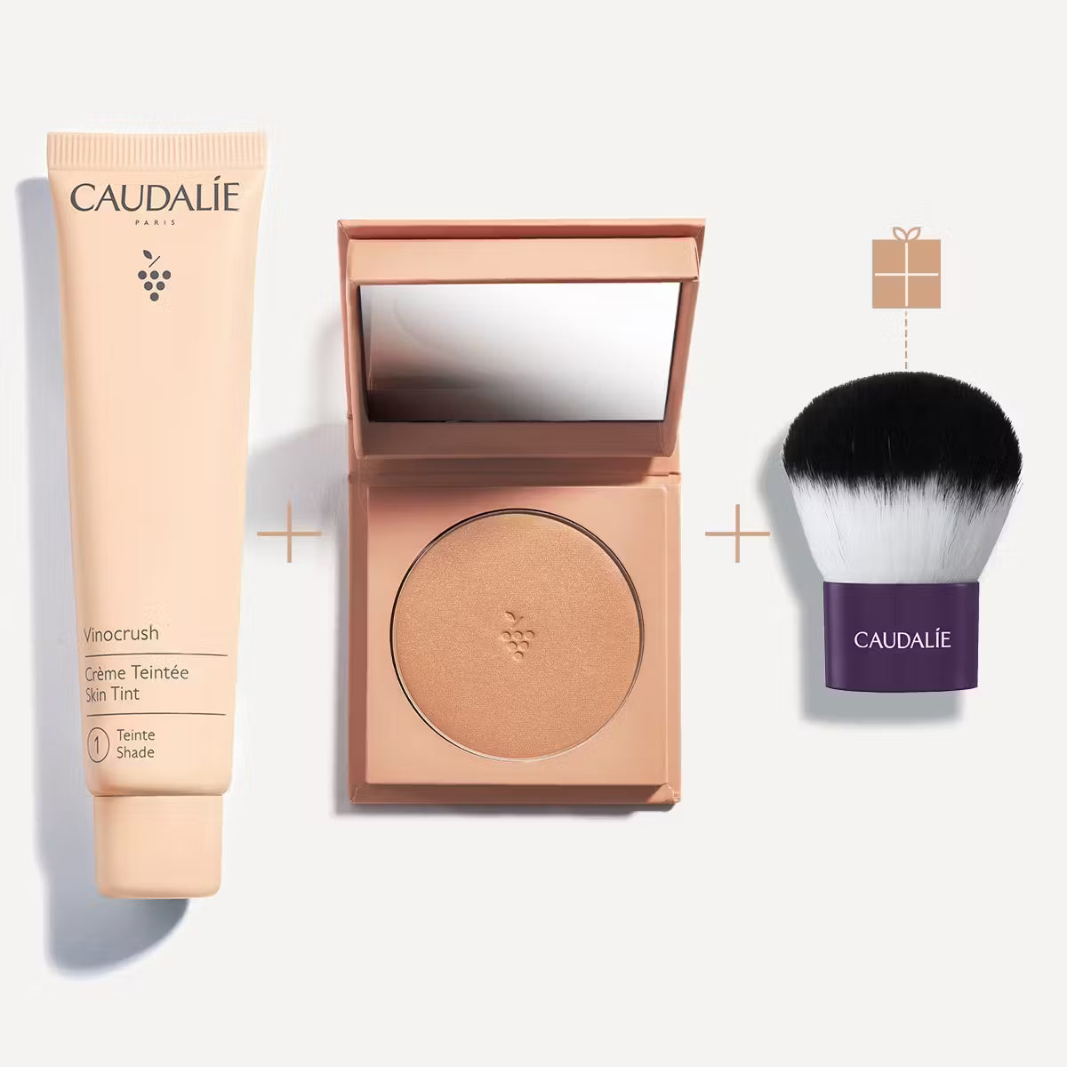 Ontdek de CC Cream, de Long Lasting Bronzing Powder en ontvang als cadeau een gratis Kabuki-kwast in ons Vinocrush-trio.