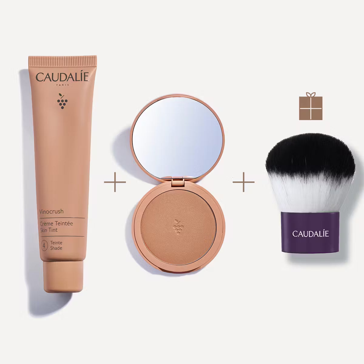 Retrouvez la CC Crème teinte 4, la Poudre Bronzante Longue Tenue et en cadeau : un pinceau Kabuki offert dans notre trio Vinocrush.